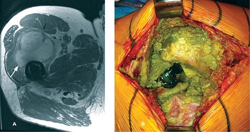 A: MARS MRI axial image with pseudotumor (arrow) anterior to the femur and metal-on-metal prosthesis;