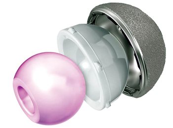 Fig. 1 Illustration of pink ceramic femoral head, white polyethylene liner, and metal acetabular cup. The femoral stem prosthesis is not shown. (From Depuy Pinnacle Polyethylene technique guide.