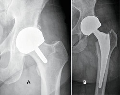 Traditional stemmed MoM hip replacements (and later resurfacings) were first introduced in the 1990s because they offered lower wear rates. For younger patients who need total hip replacement for osteoarthritis, longevity of the implant is a particularly important characteristic. It is estimated that since 1996, more than 1 million MoM implants have been inserted worldwide. MoM bearings can result from traditional hip replacement with a stemmed femoral prosthesis (Fig. 7B), or resurfacing of the femoral head with a metal cap (Fig. 7A), in which case more bone is preserved.