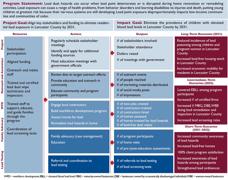 Evaluation is essential for monitoring the program, supporting continuous quality improvement, and ensuring that the investment of time and resources is achieving the intended outcomes. The overall goal of the initiative is to prevent lead poisoning in Lancaster County. Thus, the program evaluation aims to answer the following broad questions: