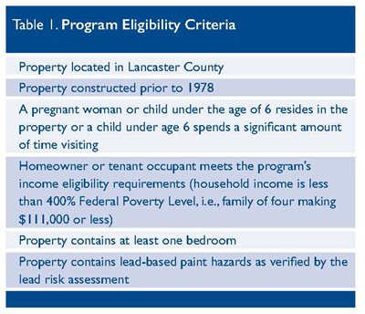 Lead-Free Families aims to increase the overall understanding of childhood lead poisoning among all residents of Lancaster County and will provide lead remediation services for families who meet the eligibility criteria (see Table 1).
