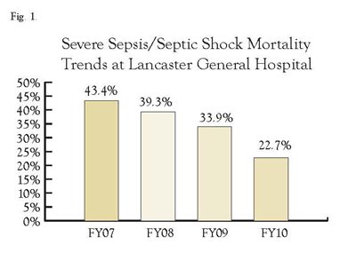 In 2006, this Journal published plans for application of the guidelines at LGH.2 Subsequent updates to the original guidelines were published by SSC in 2008,3 and were incorporated into the LGH sepsis project as well. With strong board and administrative support, a multi-departmental, multi-disciplinary project was launched with the ultimate intent of reducing the high mortality associated with severe sepsis and septic shock by adherence to the SSC guidelines. Sepsis management became a priority initiative for Quality Improvement at LGH.