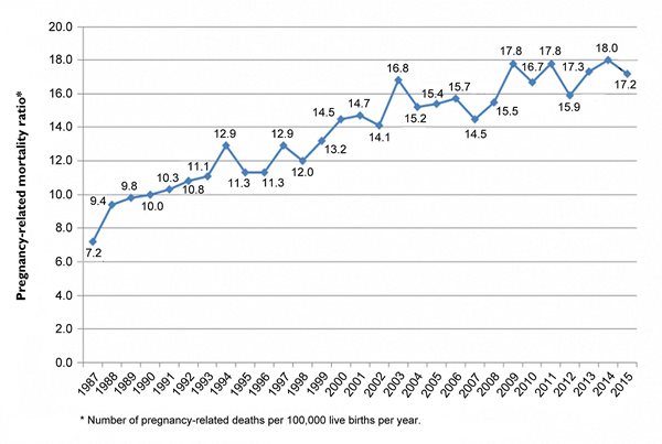 Fig. 1. Trends in Pregnancy-Related Mortality in the United States 1987-2015. Source: Centers for Disease Control and Prevention Pregnancy Mortality Surveillance System.