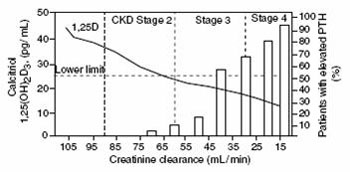 Testing—Guidelines from the Kidney Disease Outcomes Quality Initiative (K/DOQI) recommend routine testing of serum calcium and phosphorus levels, and plasma parathyroid hormone levels, in all patients with a GFR <60 cc/min.12 This is a new paradigm, as previously parathyroid hormone levels were only measured if calcium and phosphorous abnormalities were clinically apparent. Parathyroid hormone levels are now measured annually in stage 3 patients, and every 3 months in stage 4 patients. More frequent parathyroid hormone testing is recommended for patients receiving vitamin D treatment, along with routine monitoring of calcium and phosphorus levels. Intact parathyroid hormone levels < 70 pg/mL in stage 3 patients, and < 110 pg/mL in stage 4 patients, are considered acceptable.