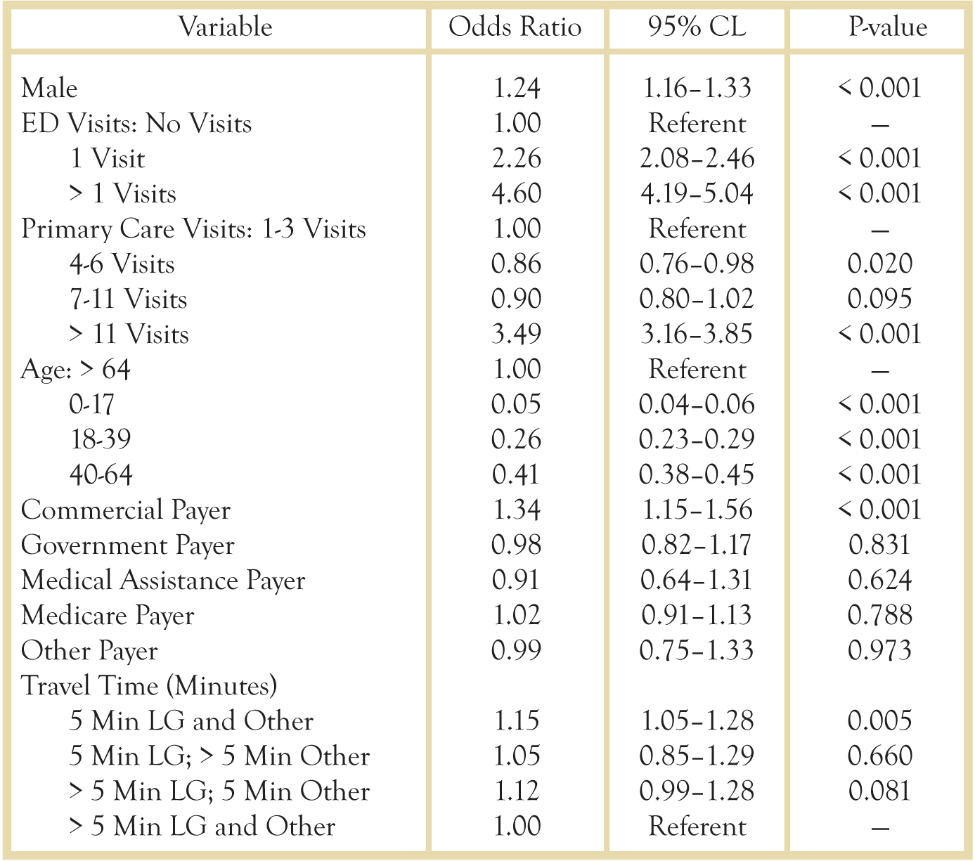 In contrast with factors for ED super utilizers, factors associated with inpatient super utilizers included not only higher volumes of ED and primary care visits, but male gender, age 65+, commercial payer status, and shorter travel times to Lancaster General and other hospitals (Table 4).